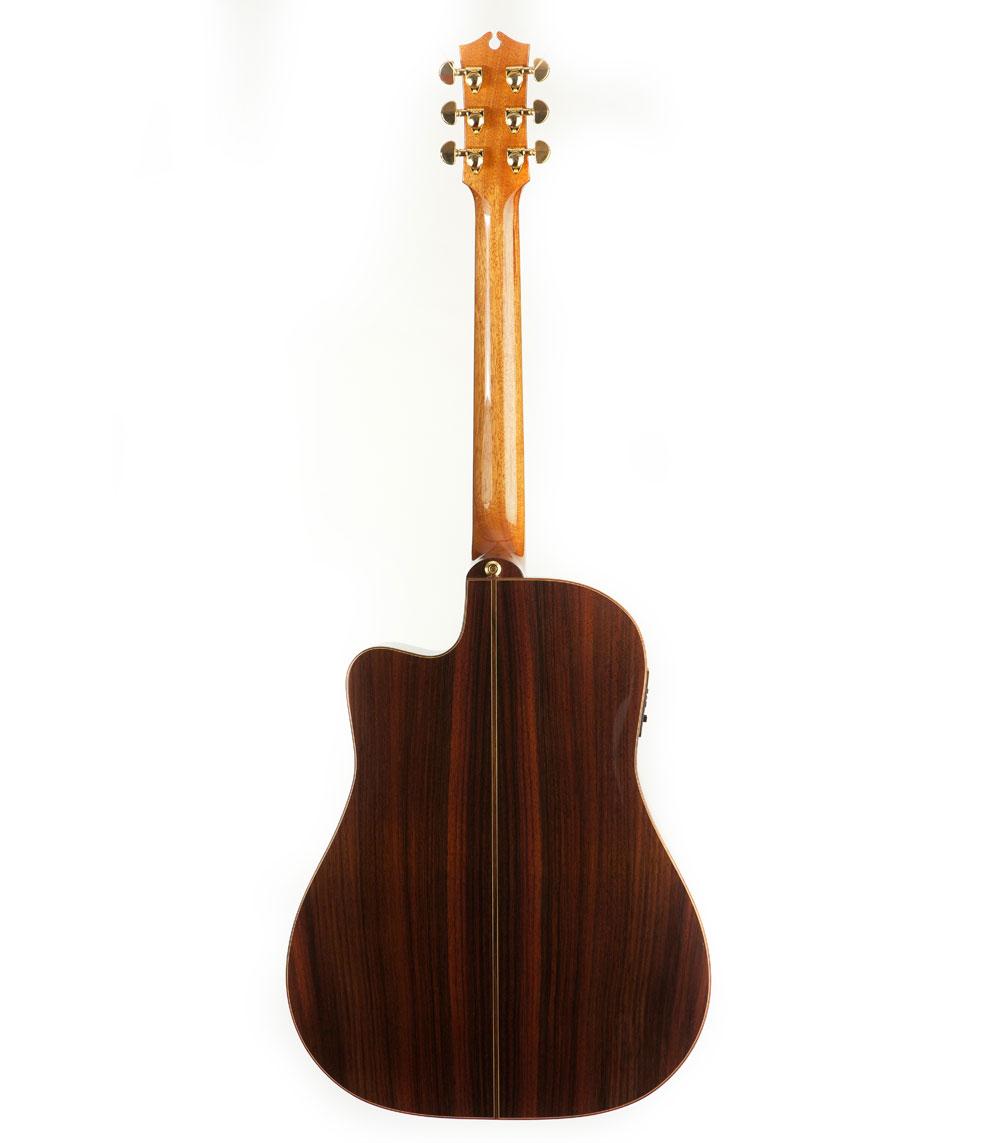 Die Dreadnought-Korpusform sorgt für ein kraftvolles Volumen und eine ausgezeichnete Projektion. Der venezianische Cutaway ermöglicht mühelosen Zugriff auf die hohen Lagen, während die traditionelle spanische Hals-Korpus-Verbindung eine herausragende Schwingungsübertragung garantiert.