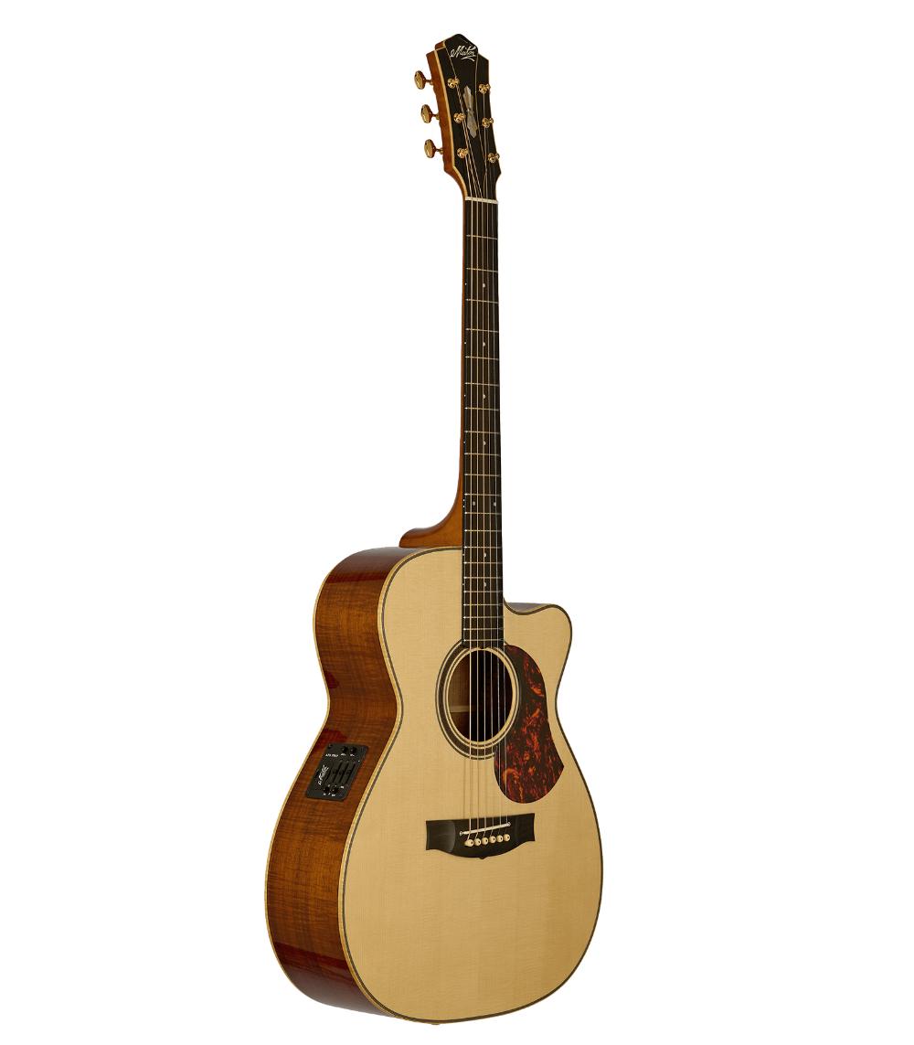 Die L.E. May ist eine schlankere Version der W.A. May und verfügt über einen durchgehenden Traditional-Cutaway-Korpus sowie eine etwas kleinere Kopfplatte, die der originalen Maton-Kopfplatte aus den 1940er Jahren nachempfunden ist. Die vom Art déco inspirierte Perleneinlage bleibt erhalten, und die Ebenholzkopfplatte ist mit Yellow Wood Ash eingefasst. Der Hals besteht aus gemasertem Queensland-Ahorn mit einem Griffbrett und Steg aus Ebenholz.