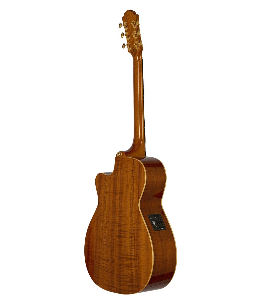 Die Decke ist aus sorgfältig ausgewählter und dicker europäischer Fichte, Boden und Zargen sind aus gemasertem Victorian Blackwood. Der Korpus ist außen mit Satin Box und innen mit BWB-Binding eingefasst. Das Schallloch ist mit einer Holzrosette versehen, die perfekt zum Rest der Gitarre passt.