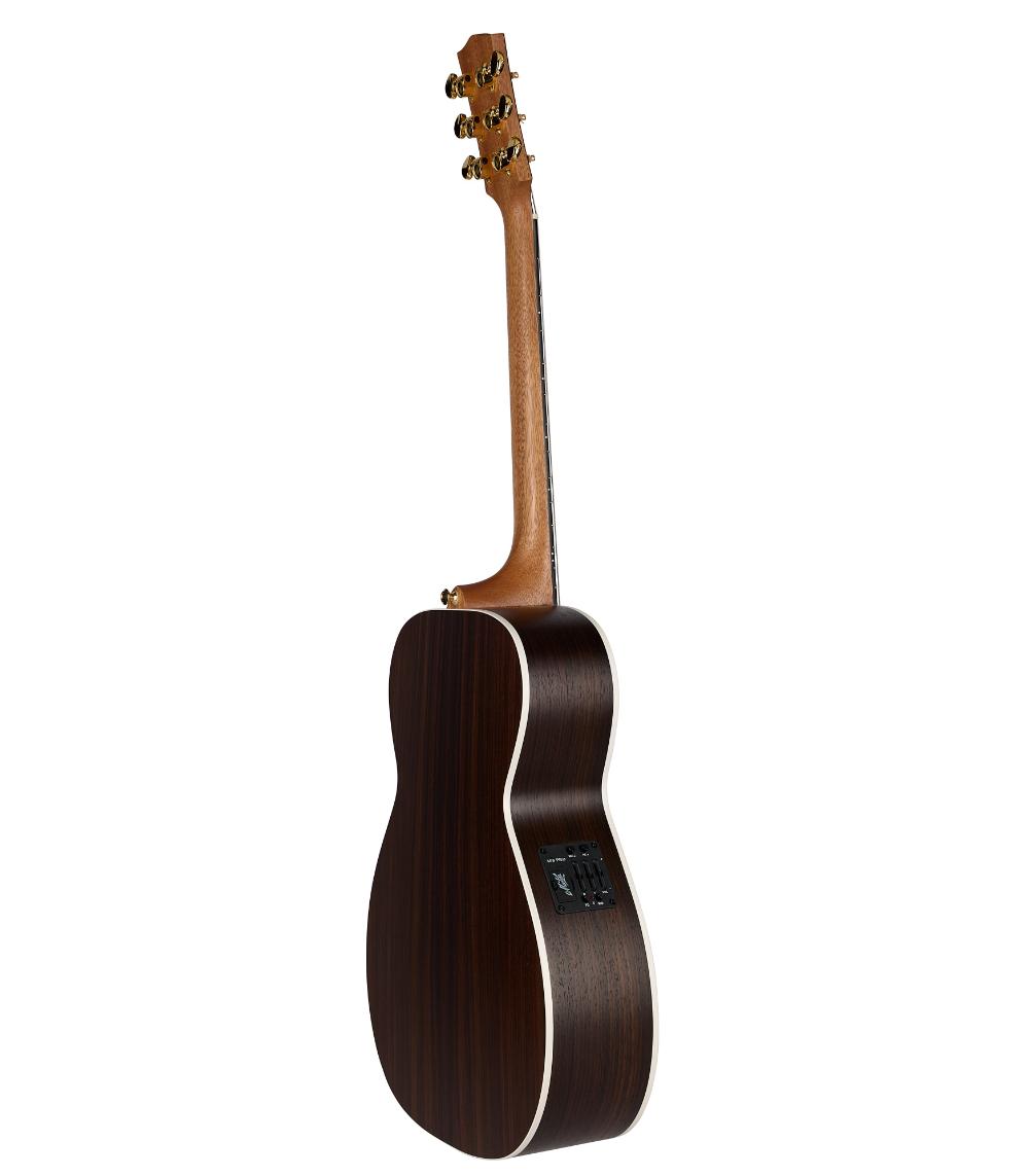 Die massive Fichtendecke sorgt für eine brillante Ansprache und definierten Höhen, während Boden und Zargen aus massivem Palisander dem Klang eine satte Tiefe und warme Mitten verleihen. Der massive Mahagoni-Hals bietet eine optimale Schwingungsübertragung und sorgt für angenehme Bespielbarkeit.